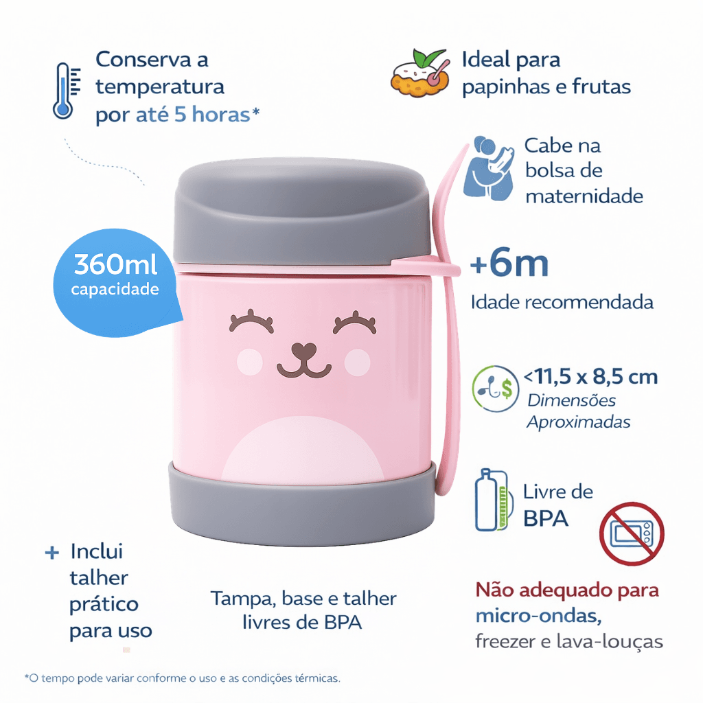 O Pote Térmico da marca Buba é a solução ideal para manter a comida do seu bebê fresca e na temperatura certa. Com materiais premium e isolamento térmico avançado, mantém os alimentos quentes ou gelados por até 5 horas, preservando sabor e nutrientes. Sua durabilidade e praticidade fazem dele o companheiro perfeito para uso diário ou em viagens, garantindo uma alimentação saudável e deliciosa onde quer que você esteja. Experimente e proporcione mais conforto e praticidade para a alimentação do seu bebê.