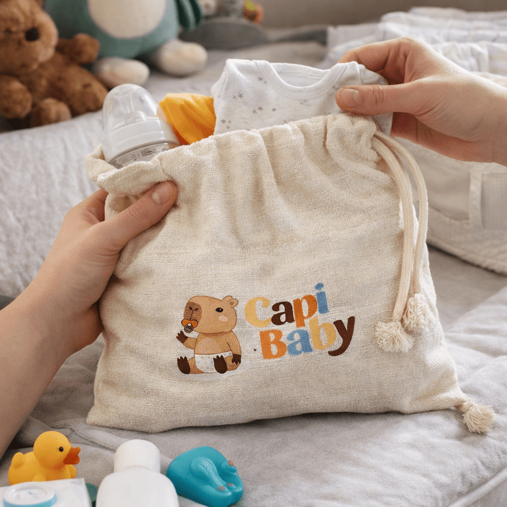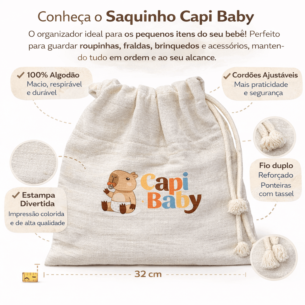 Conheça o saquinho Capi Baby, o organizador ideal para os pequenos itens do seu bebê! Perfeito para guardar roupinhas, fraldas e brinquedos, mantendo tudo em ordem e ao seu alcance. O fechamento com corda oferece praticiade e segurança. Feito de algodão cru de alta qualidade, é suave, respirável e durável, além de ser uma escolha sustentável. Ao escolher este material, você opta pelo melhor para o seu bebê e para o planeta. Na Capi Baby, sabemos que cada detalhe importa na jornada da maternidad. Este produto exclusivo não só organiza, mas também traz carinho e cuidado.